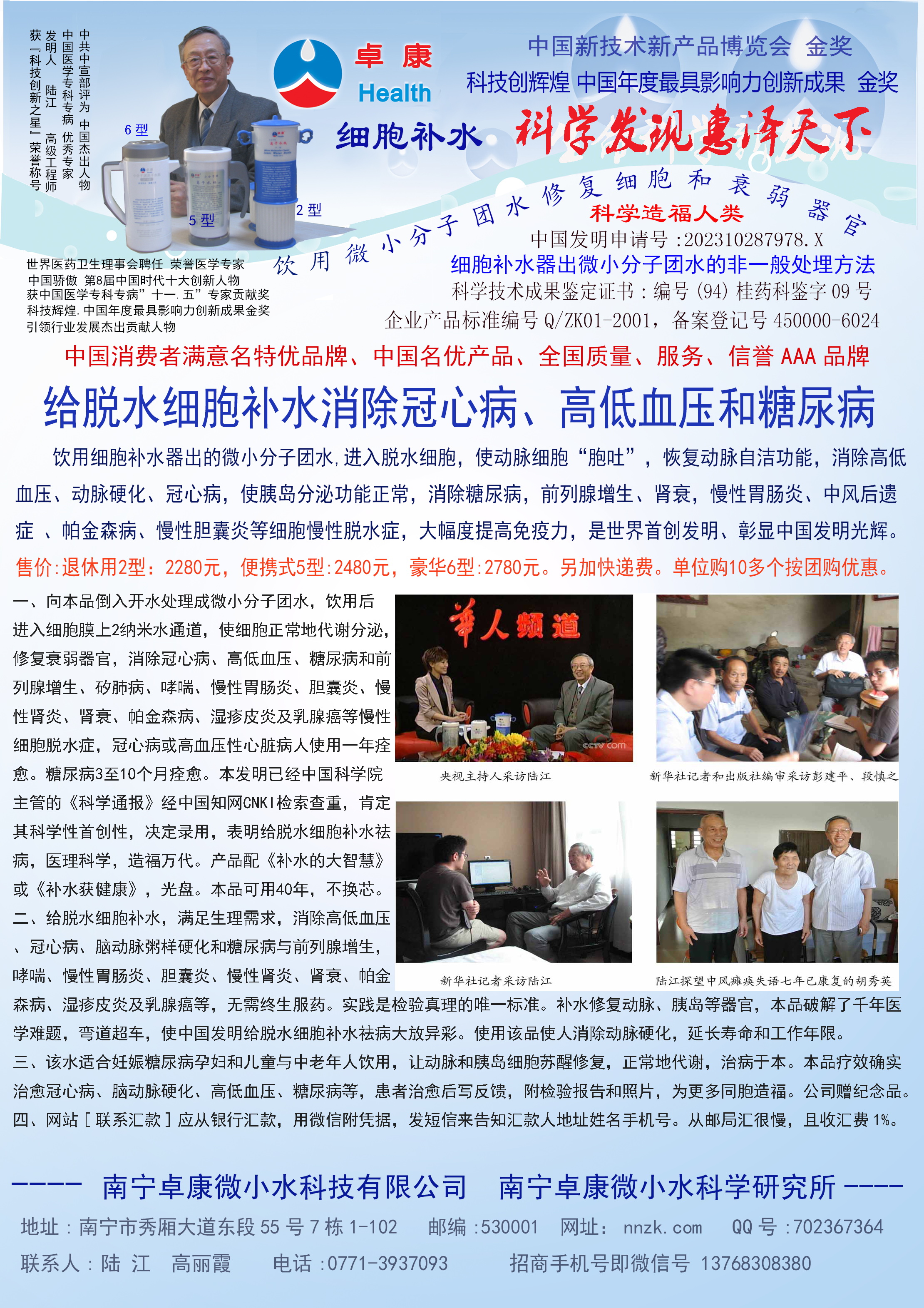 人類幾千年來患以上病癥需終生服藥,幾十年也不能治愈??墒俏覈蠈幍母呒壒こ處熽?nbsp;江,于1990年想根治高血壓,研究發明了離子水瓶,處理出微小分子團水供飲用,經過醫院臨床試用和專家鑒定,1999年獲中國發明專利權,產品于2000年投放市場后一直跟蹤調查,據全國各地用戶反饋:祛除了高低血壓、糖尿病和冠心病,并使前列腺增生、咽喉炎、鼻竇炎、慢性氣管炎、支氣管炎、矽肺病、哮喘、慢性胃炎、腸炎、慢性膽囊炎、慢性腎炎、腎衰、膀胱炎、便秘、痔瘡、風濕性關節炎和濕疹皮炎及中風后遺癥等病癥不藥而愈。為什么喝微小水能治20多種病?陸 江從1991年德國科學家發現細胞膜水通道僅為2納米獲得啟發,認為多種器官患病是因細胞脫水,不能正常代謝和分裂增殖,才使器官細胞減少致衰弱萎縮而形成細胞缺水性病癥。22年來的實踐有力地支持了“細胞脫水致病”這一重要論點,表明喝微小水可滿足細胞的生理需求,補水就能祛病,是生命科學新亮點。
